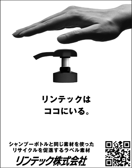 使い捨てプラスチック容器をリサイクルする重要性が高まる中、シャンプーボトルやペットボトルに貼られる粘着ラベルは、容器と異なる材料となるため分別する必要があり、リサイクル効率低下の一因とされてきました。そこで当社では、容器を廃棄する際にラベルをきれいに剥がせる粘着剤の提案に加え、PET製容器と同質の素材でできたラベル素材を開発。ラベルの表面基材・粘着剤ともにポリエステル系の素材で構成されているため、ラベルが残ってしまった場合でもリサイクルの妨げとなりにくい性能を実現しました。表面基材には特殊な処理を施しており、ペットボトルの洗浄工程で行われるアルカリ温水洗浄によって、印刷されているインクを剥がして除去することも可能。リサイクルの障壁となる異物混入の課題解決に貢献します。日用品や飲料、食品などに使用される容器とのモノマテリアル化(単一素材化)を実現した環境配慮製品として、提案を強化しています。